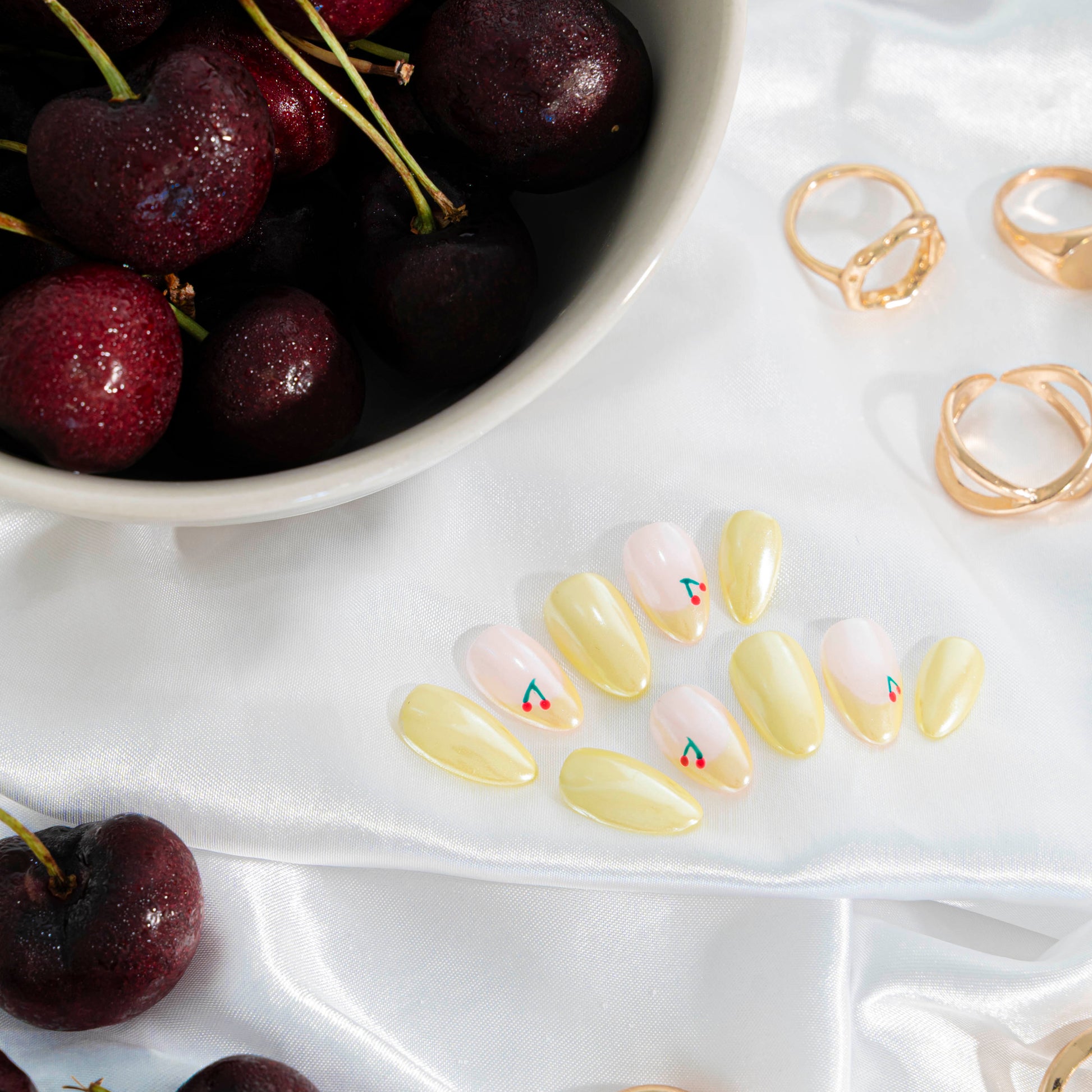 Inspirado en una merienda de verano: suave, dulce y con una cereza por encima. Uñas color crema con efecto glaseado y pequeñas cerezas dibujadas a mano: tan delicadas como un postre casero servido en un mantel de picnic 🧺