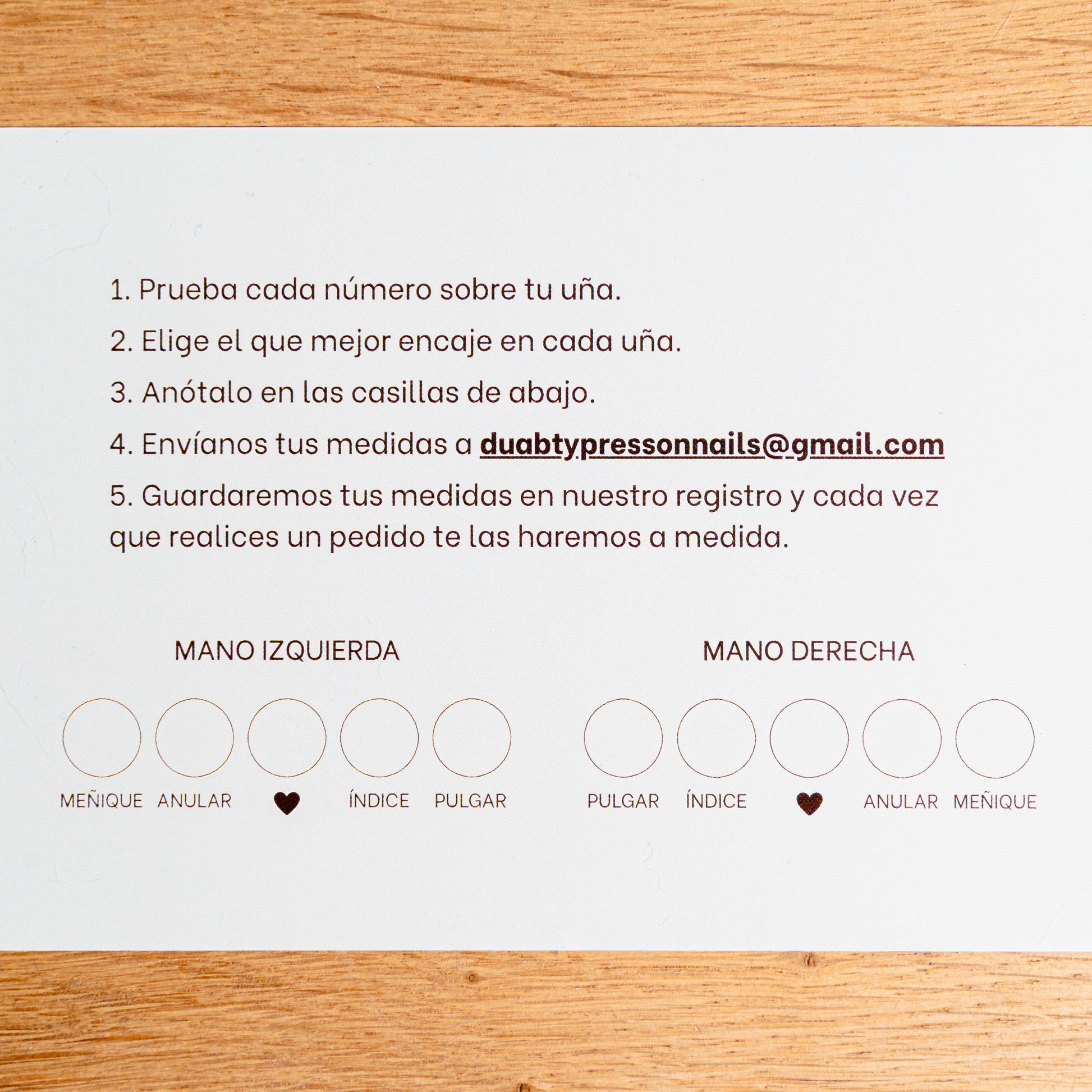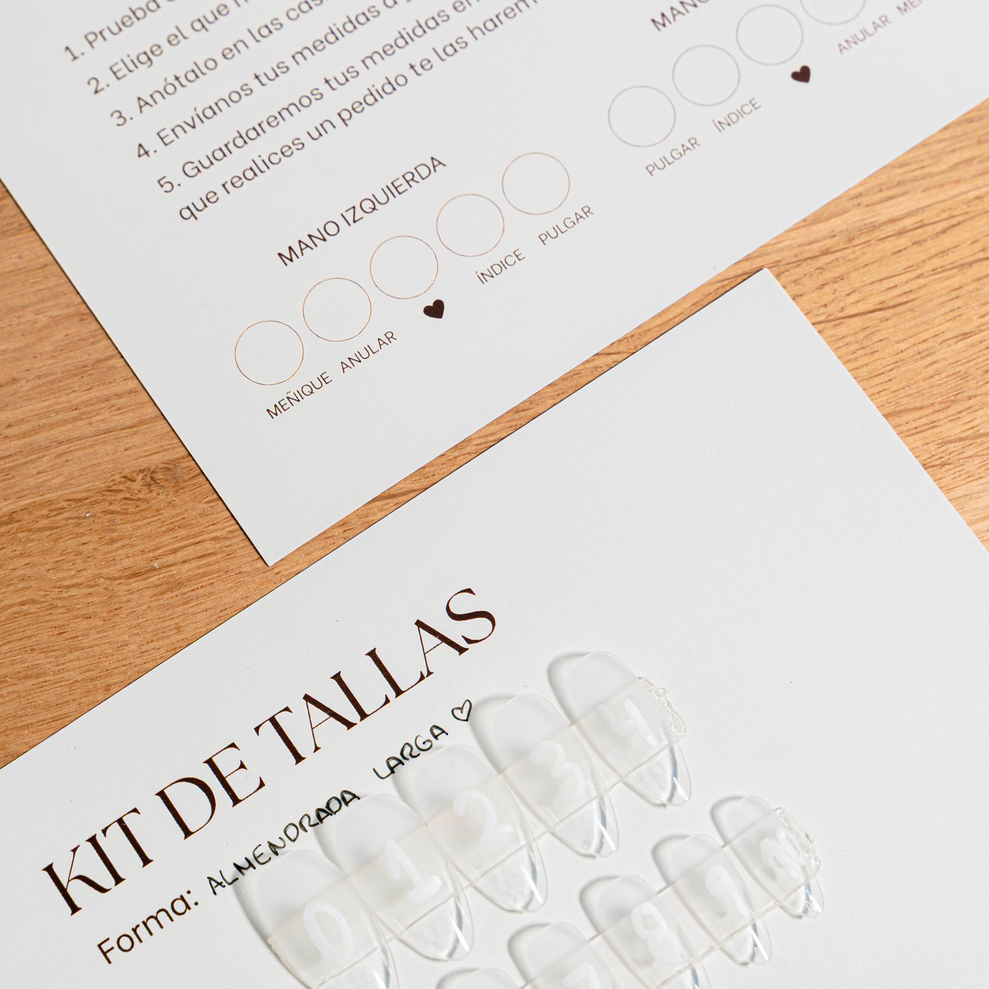 Con este kit recibirás todas las medidas de uñas en tamaño real para que pruebes cuál se adapta mejor a tus uñitas.