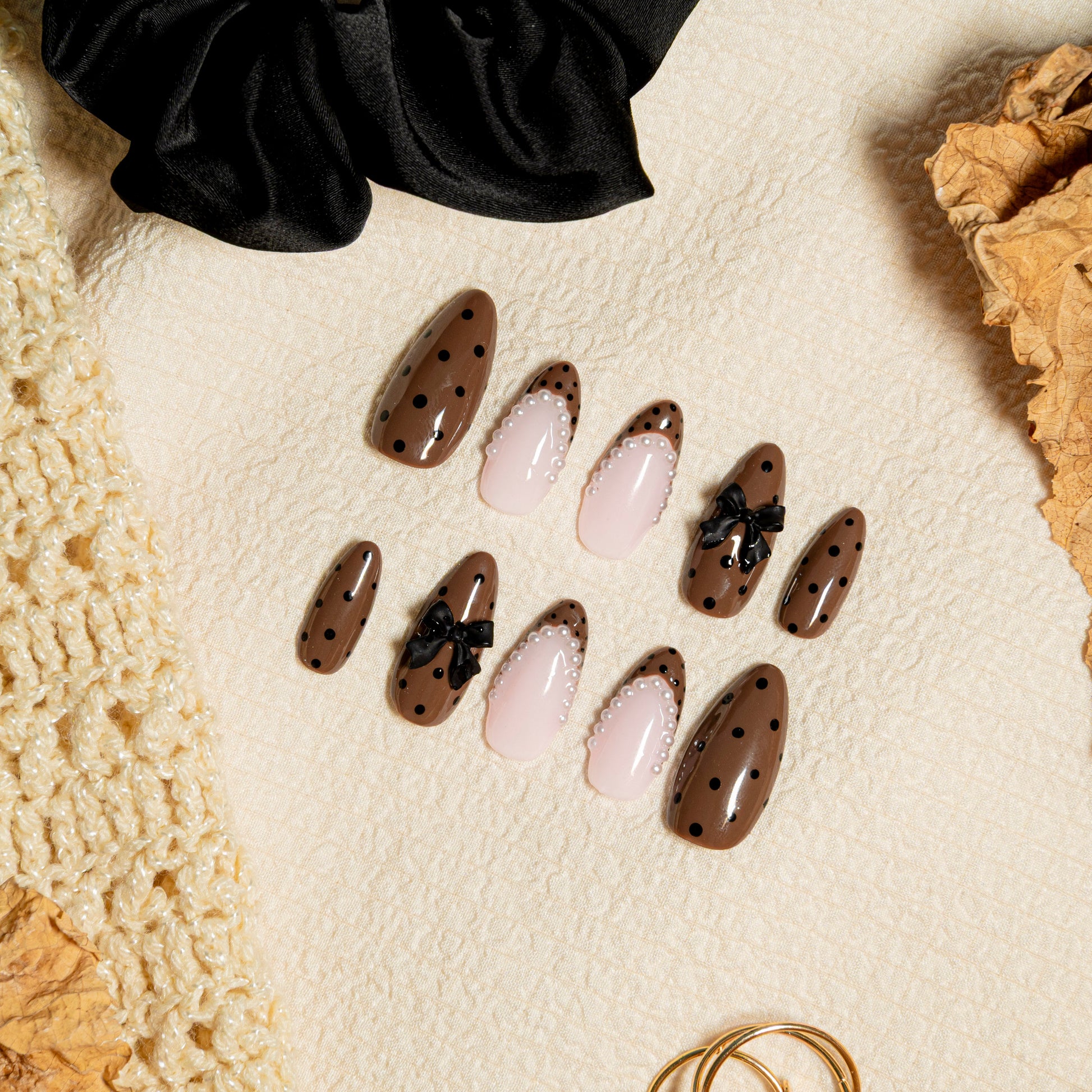 🖤🍂 Autumn Dots: marrón otoñal, puntos negros, perlitas y un lazo chic en un set lleno de estilo.